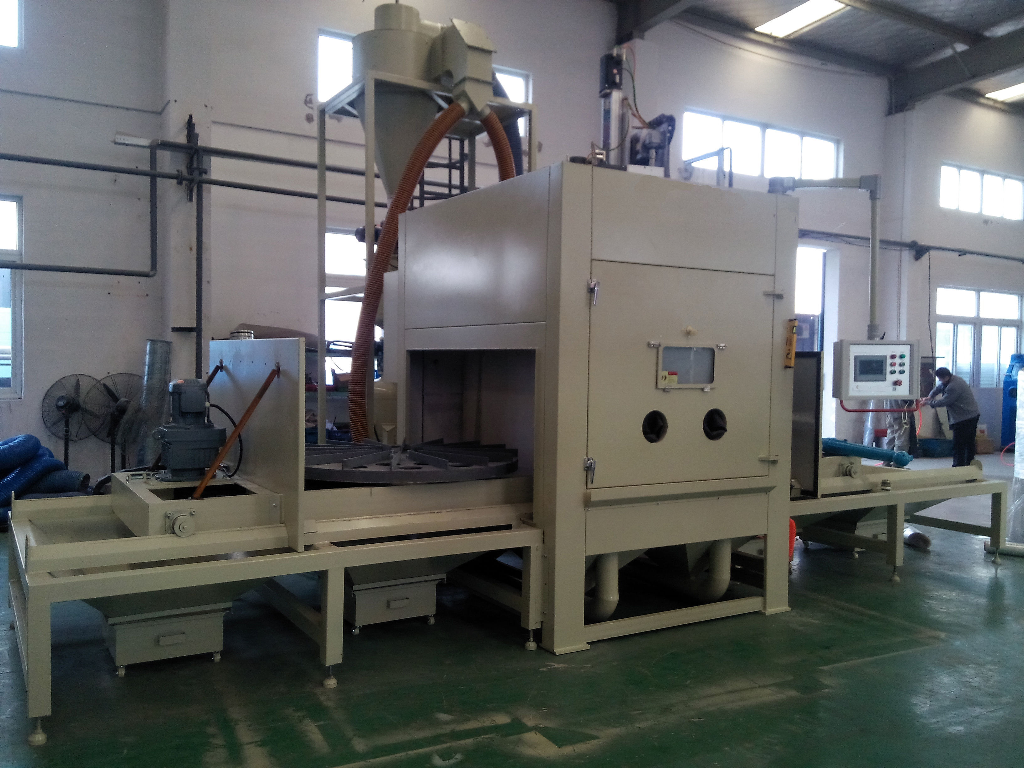 5.本設備適用于各類模具的清理,不傷及模具表面,保證模具精度。該機由主機、除塵箱、分離器、自動臺車、噴砂系統(tǒng)、空氣壓縮系統(tǒng)(客戶自備)、電氣系統(tǒng)等組成。